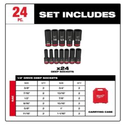 - Kit includes 24 deep SAE sockets, the following sizes are included: (2) 3/8, (2) 7/16, (2) 1/2, (2) 9/16, (2) 5/8, (2) 11/16, (2) 3/4, (2) 13/16, (2) 7/8, (2) 15/16, (2) 1, (2) 1-1/16