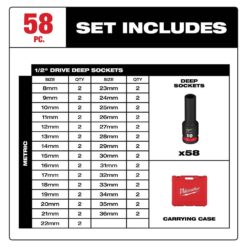 - Kit includes 58 deep metric sockets, the following sizes are included: two 8, two 9, two 10, two 11, two 12, two 13, two 14, two 15, two 16, two 17, two 18, two 19, two 20, two 21, two 22, two 23, two 24, two 25, two 26, two 27, two 28, two 29, two 30, two 31, two 32, two 33, two 34, two 35, two 36