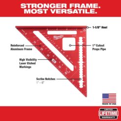 The Milwaukee REDSTICK Box Levels provide industry-leading performance with best-in-class vial readability and frame durability. The ALL-METAL BACKBONE provides the strongest, most durable frame ensuring long-life accuracy. SHARPSITE Vial Technology provides best-in-class readability with a magnified bubble and high-visibility vial spirit. The Milwaukee REDSTICK Box Levels are backed by a Lifetime Accuracy Guarantee and a Limited Lifetime Warranty. The Milwaukee 7 in. rafter square has a stronger frame and is the most versatile rafter square. It features scribe notches from 1 in. to 6 in. allowing for easy ripping of lumber. A 1 in. cutout helps prop pipe making it easier to cut on the job sites. A reinforced frame provides durability on the job site and high visibility laser etched markings make it easy to read.