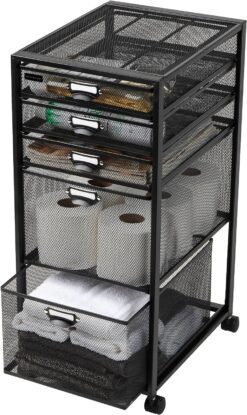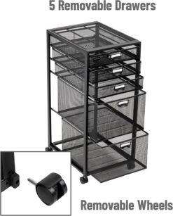 MIND READER Rolling File Cabinet with Drawers [5 Drawers] Craft Cart Organizer with Wheels, Slim Storage for Makeup, Kitchen, Utilities, Office Supplies, and Tools (BLACK MESH)