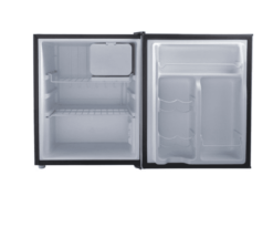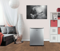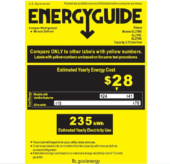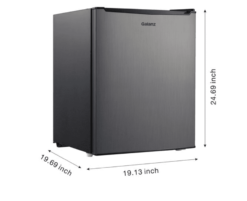 Galanz 2.7 Cu Ft Single Door Mini Fridge GL27S5, Stainless Steel: Color: Stainless Steel Look 2.7 Cu. Ft. capacity Product Dimensions: 19.69″ L x 19.13″ W x 24.69″ H Package Dimensions: 21.65″ x 20.87″ x 26.97″Â Single Door 2 wire shelves, slide-out Handy Can Dispenser Compressor with R600a coolant Half-Width Chiller Reversible Door Mechanical Thermostat 2 adjustable leveling legs D.O.E. Energy Efficiency