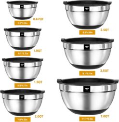 - EXTRA VALUE ACCESSORIES & 7 SIZES NESTING BOWLS SET: Super versatile combination set including 6 size mixing bowls0.67, 1, 1.5, 2, 2.5, 3.5, 7 quart, meet your various kinds of kitchen needs, comes with basting brush, spreader spatula, flexible spatula, egg whisk, egg separator and 6 measuring spoons for better helping you cook more easily