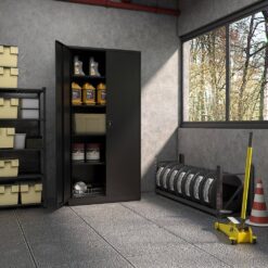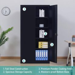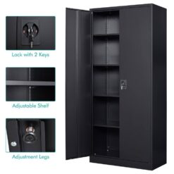 - 【SUFFICIENT SPACE】This black metal cabinet has 4 shelves and 2 locking doors, which provide ample space for home and office supplies and other valuable items. It will suit any commercial office decor or home garage storage.