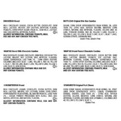 Milk Chocolate (Sugar, Chocolate, Skim Milk, Cocoa Butter, Lactose, Milkfat, Soy Lecithin, Salt, Artificial And Natural Flavors), Sugar, Cornstarch, Less Than 1% – Corn Syrup, Dextrin, Coloring (Includes Blue 1 Lake, Yellow 6, Red 40, Yellow 5, Blue 1, Yellow 6 Lake, Red 40 Lake, Yellow 5 Lake, Blue 2 Lake, Blue 2), Carnauba Wax, Gum Acacia.Milk Chocolate (Sugar, Chocolate, Skim Milk, Cocoa Butter, Lactose, Milkfat, Peanuts, Soy Lecithin, Salt, Artificial And Natural Flavors), Sugar, Peanuts, Cornstarch, Less Than 1% – Palm Oil, Corn Syrup, Dextrin, Coloring (Includes Blue 1 Lake, Red 40, Yellow 6, Yellow 5, Blue 1, Red 40 Lake, Yellow 6 Lake, Yellow 5 Lake, Blue 2 Lake, Blue 2), Carnauba Wax, Gum Acacia.Milk Chocolate (Sugar, Chocolate, Cocoa Butter, Skim Milk, Lactose, Milkfat, Soy Lecithin), Sugar, Corn Syrup, Vegetable Oil (Hydrogenated Palm Kernel Oil And/Or Palm Oil), Cocoa Powder Processed With Alkali, Less Than 1.5% – Salt, Egg Whites, Artificial And Natural Flavors.Sugar, Corn Syrup, Hydrogenated Palm Kernel Oil; Less Than 2% – Citric Acid, Tapioca Dextrin, Gelatin, Apple Juice From Concentrate, Modified Corn Starch, Natural And Artificial Flavors, Colors (Red 40, Yellow 5, Yellow 6, Blue 1).