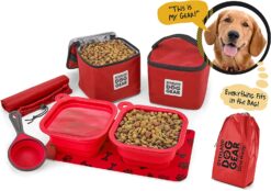 Mobile Dog Gear, Dine Away Dog Travel Bag for Medium and Large Dogs, Includes Lined Food Carriers and 2 Collapsible Dog Bowl, Collapsible Scooper and Placemat, Red