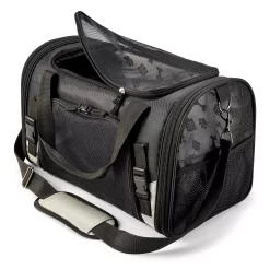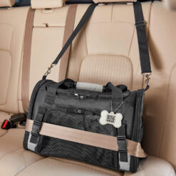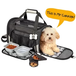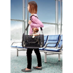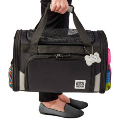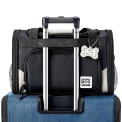 The interior of the bag was designed strictly with your dog’s comfort in mind. It is fully padded and contains a removable padded bottom that contains machine washable liner. Your furry friend will never complain of discomfort in this bag. The Pet Carrier Plus was designed to make traveling by hand, car or plane as easy as possible. It contains seat belt clips to lock it into a car, a luggage strap that fits over a pull-up handle and a collar tether for extra safety. Tons of pockets to hold everything you need. There are mesh pockets on two sides as well as a zippered pocket on a third side with another mesh pocket in it.