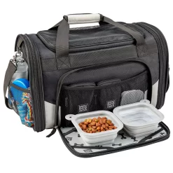 The Mobile Dog Gear Pet Carrier Plus allows you to travel with your dog with ease as it not only keeps your dog safe, but comes with our patent-pending feeding system. (Two lined food/treat carriers, two collapsible silicone bowls and removable placemat). The ballistic fabric exterior with breathable mesh for ventilation on the top and three sides is not only stylish, but more importantly, extremely safe and durable for carrying your furry best friend. There is a waterproof bottom with rubber feet to make sure you can place this bag comfortably on any surface. There are locking zippers on all entries and front access to comfort your pet.