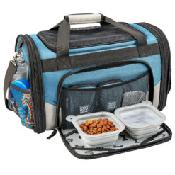 If you like to travel with your furry best friend then you must check out the Mobile Dog Gear Pet Carrier Plus. Not only is this one of the most stylish pet carriers, but it stands out from all other carriers as it also comes with our patent-pending feeding system. This feeding system includes two lined food/treat carriers, two collapsible silicone bowls and a removeable placemat. The Pet Carrier Plus can hold dogs up to 15 lbs. and is made from durable ballistic fabric exterior with breathable mesh for ventilation on top and three sides. The bottom is waterproof so you never have to worry when placing your bag on any surface. It comes with a fully padded interior including a padded bottom with machine washable liner for extra comfort and convenience. It contains a collar tether for safety, along with seat belt clips and a luggage strap to make maneuvering your pet carrier in any situation as easy as possible.