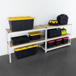 The MonsterRAX 18″ x 48″ x 72″ modular garage shelf features four adjustable, 5/16 inch MDF shelves providing up to 45 cubic feet of storage. Multi-function construction allows the shelf to be assembled as single 72” tall 5-tier shelf or two 36” tall shelving units. Our steel shelf supports utilize a strong C-channel design and center support to maximize weight capacity (1500 lb max weight capacity/300 lb per shelf).