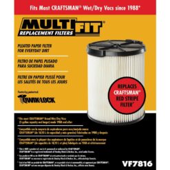 Have a CRAFTSMAN wet/dry vacuum filter on hand whenever the job calls for it with this 6-count, 1-layer pleated paper filter value pack – buy more and save more. The MULTI FIT Craftsman 1-layer replacement wet/dry shop vac filter is designed to pickup everyday dirt such as sawdust or typical debris found in basements, garages or vehicles. This MULTI FIT replacement filter is compatible with most CRAFTSMAN wet/dry vacs (5 – 20 Gal.s) made 1988 or after with the Qwik Lock filter cage. The shop vacuum filter can be washed and, if dried properly, reused. Filters also help extend vacuum life as it protects the motor from harmful dust and debris. When vac performance decreases, it is recommended to change the filter for optimal power and with the simple installation, it makes filter changes a breeze. To install, press down near the center of the filter with both thumbs until the rubber opening of the filter locks in securely over the shop vac filter cage. A 3-count value pack size is also available to accommodate a variety of jobs or project needs. The filter is 7.69 in. tall and has a diameter of 6.34 in. and should only be used for dry pickup.
