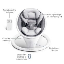 When you need a second or third set of arms to get through the day, Munchkin’s Bluetooth-enabled Swing is here for you! A study in sleek functionality and smart design, this baby swing has a compact silhouette that’s easy to put together and break down again. It recreates the calming side-to-side swaying motion most babies love, making it the next best thing to being cradled in your arms. The included remote lets you control everything from the motion and timer to the selection of calming sounds. Soothe your mini impresario with classical music or one of eight ambient sounds. The swing is Bluetooth compatible so you can connect to your phone and stream baby’s favorite tunes, too! At under 10 pounds, this lightweight Munchkin swing conveniently disassembles into two parts, so you can store it away in tight spots – even under the bed!