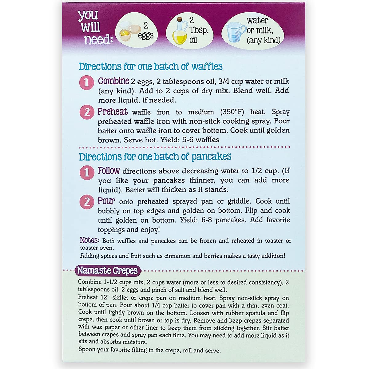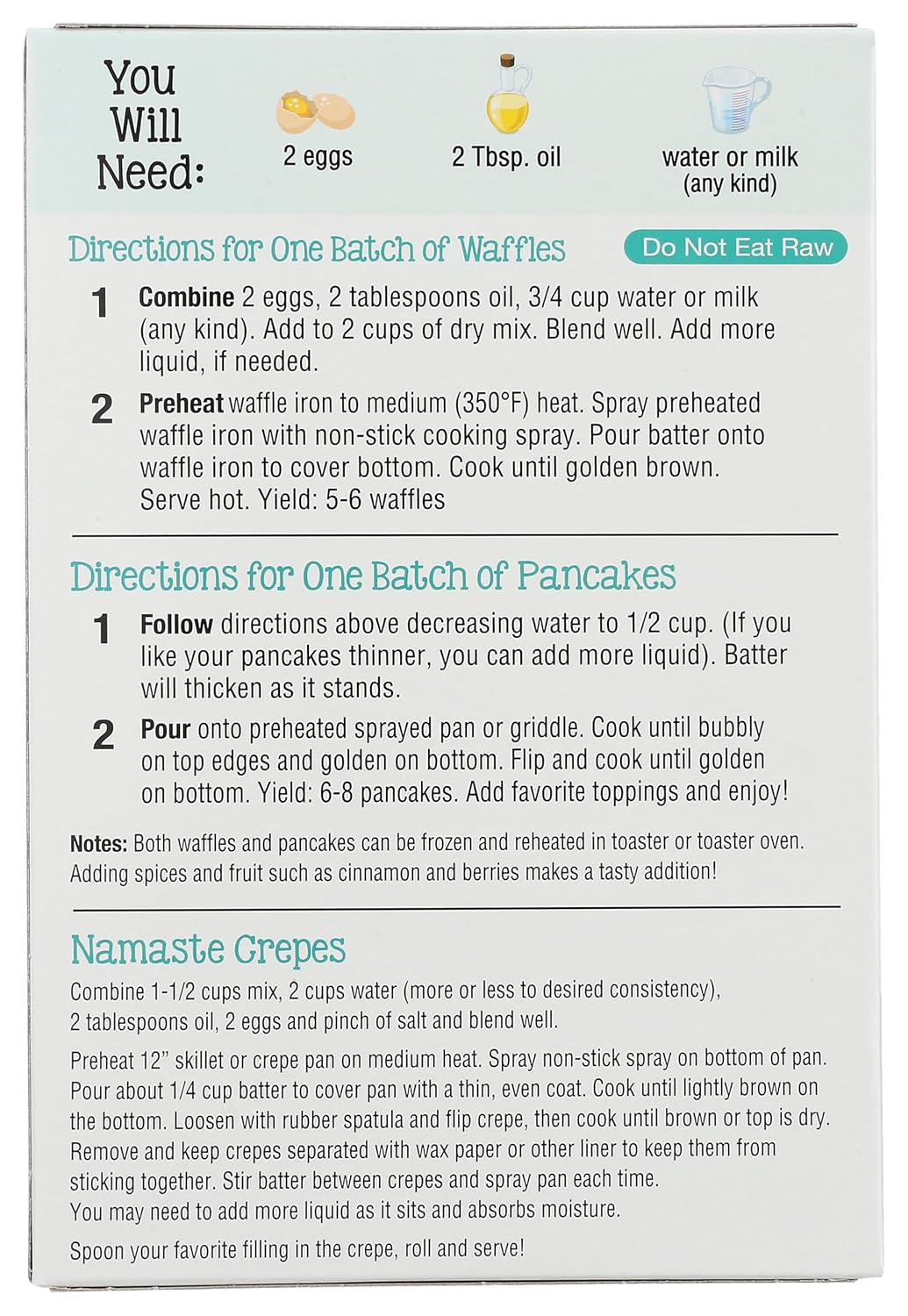 What You Need: eggs, oil, water. Baking Directions for One Batch Waffles: 1. Mix: Combine 2 eggs, 2 tablespoons oil, and 1 cup water or rice milk. Add to 2-1/3 cups of dry mix, stir until blended. 2. Bake: Pour onto preheated, sprayed waffle iron to cover