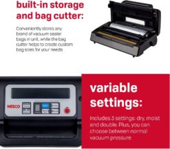 The NESCO VS-12 Deluxe Vacuum Sealer offers all the versatility and performance you could ever need from a vacuum sealer. Choose from three seal settings: Dry, Moist, and Double; then choose your vacuum pressure ”Normal or Gentle” to keep softer foods safe. The built-in bag cutter and roll storage compartment with clear viewing window make this an all-in-one stop for keeping food fresh up to 5 times longer than traditional methods. This sealer can accommodate up to an 11.8″ width bag providing the versatility needed for a wide range of sealing jobs. Two rolls are included to get you started, one 8.6″ x 9.85″ roll and one 11.8″x 9.85″ roll. The NESCO Deluxe Vacuum Sealer is compatible with any brand of vacuum sealer bags.