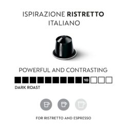 ISPIRAZIONE RISTRETTO ITALIANO: A powerful and contrasting coffee blend. Intensity 10. A fusion of Arabica Beans from South America combined with Robusta.