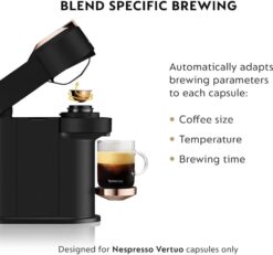 - SIGNATURE COFFEES AND ESPRESSOS: Vertuo Next offers a variety of coffee formats in 6 sizes, including 5, 8, 12oz coffees, as well as single and double espressos brewed hot or over ice.