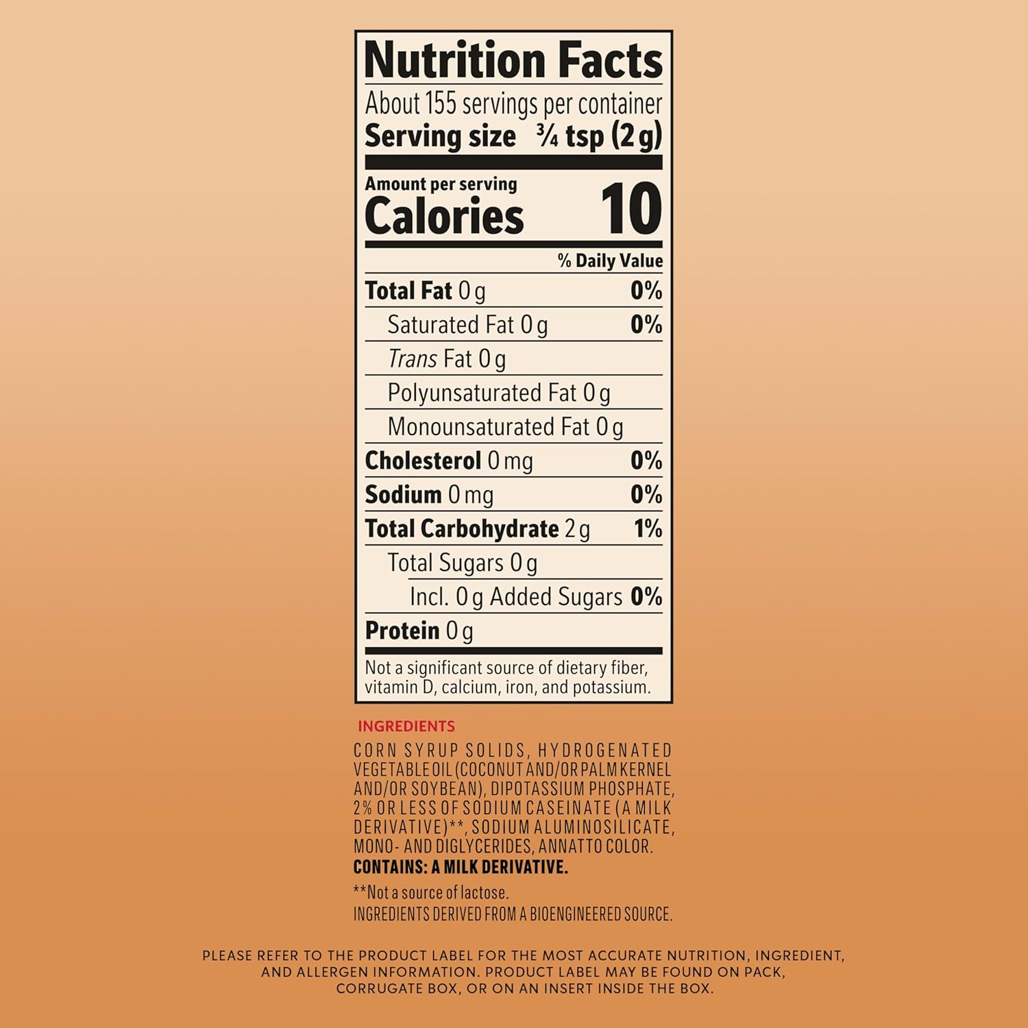 Ingredients: CORN SYRUP SOLIDS, HYDROGENATED VEGETABLE OIL (COCONUT AND/OR PALM KERNEL AND/OR SOYBEAN), 2% OR LESS OF SODIUM CASEINATE (A MILK DERIVATIVE) **, DIPOTASSIUM PHOSPHATE, COLOR ADDED, MONO- AND DIGLYCERIDES, SODIUM ALUMINOSILICATE, SUGAR, ARTIFICIAL FLAVOR, ANNATTO COLOR.
