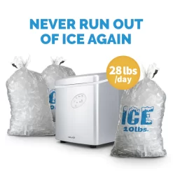 This NewAir countertop ice maker keeps you in a steady supply of ice for entertaining at home or everyday use. This compact ice maker looks great in your kitchen, but is also versatile enough to make 3 sizes of ice for any occasion. This NewAir countertop ice maker produces 28 pounds of bullet ice each day and keeps it cold in a well insulated storage compartment. Choose from four stylish colors: black, red, stainless steel or silver.