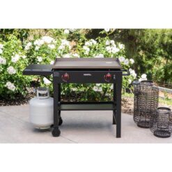 Enhance your outdoor grilling experience with this 2-burner propane gas grill. Designed with tough resin, it offers two 38,000 BTU burners that let you cook within 514 sq. in. of space. A tough, pre-seasoned, hot-rolled griddle top and a left side shelf for prep allow more convenient cooking. The electronic ignition makes lighting easy, and two fixed caster wheels ensure quick moving.