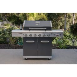 Expand your grilling repertoire with the Nexgrill Deluxe Series 6-Burner Gas Grill in Slate. It is equipped with a 15,000 BTU ceramic searing side burner that sears meats to juicy perfection and includes a plug-in rotisserie kit to evenly cook chicken, roasts, pork or anything else you want to rotate on a spit. For nighttime grilling, engage the blue LED lighting system to illuminate the front control panel for no-fuss operability. Boasting a massive 560 sq. in. primary grilling area with six stainless steel burners, it’s outfitted with porcelain-enameled cast iron cooking grates that retain heat exceptionally well. An upper-level 200 sq. in. porcelain-coated warming rack heats up buns and keeps cooked foods toasty. Perched above the main firebox burners are angled flame tamers that deflect heat, prevent flare-ups and vaporize drippings into flavor infusions that permeate foods with a distinctive smoky taste. This Even-Heat System distributes consistent and uniform heat across the entire grill surface so there aren’t any hot spots. Electronic ignition allows burners to fire up instantly and the built-in thermometer enables precise temperature regulation. It’s easily portable thanks to heavy duty casters that also lock into position when you need it stationary. This grill model is convertible to natural gas; conversion kits (Nexgrill 710-0888 and Universal Parts NG Kit 710-0007) can be purchased at Home Depot or homedepot.com.