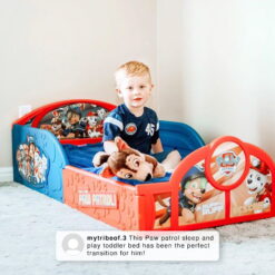 Transition their space from a nursery to a toddler room with the perfectly sized PAW Patrol Plastic Sleep and Play Toddler Bed from Delta Children. Featuring three-dimensional paw prints paired with colorful decals of Marshall, Chase, and the whole PAW Patrol pack, this study toddler bed creates a comforting environment that promotes a sound sleep. The PAW Patrol Plastic Toddler Sleep and Play Bed will also keep your little big kid secure throughout the night, its attached guardrails and low mattress height allows your child to enter and exit on their own. Attached Guardrails: Attached guardrails will ensure your little one is safe and secure throughout the night. A low mattress height makes it easy for kids to enter and exit on their own, reinforcing their big-kid independence. Sturdy Plastic: Built to last, this toddler bed?s sturdy plastic construction creates a cozy, inviting environment, promoting sound sleep for your little one. About PAW Patrol: PAW Patrol is a CG, action-adventure preschool series starring a pack of six heroic puppies: Chase, Marshall, Rocky, Zuma, Rubble, and Skye, who are led by a tech-savvy 10-year-old boy named Ryder. With a unique blend of problem-solving skills, cool vehicles and lots of cute doggy humor, the PAW Patrol works together on high-stakes rescue missions to protect the Adventure Bay community. From Marshall the firedog to Chase the police pup to Skye, who flies high in her copter, each pup brings unique personality and skill to the team, modeling the importance of teamwork and good citizenship. They all have special Pup Packs on their backs to help them handle anything – from rescuing kittens to saving a train from a rockslide! No matter how big the adventure, the PAW Patrol always has time for a game, a laugh, and an ear scratch from Ryder.