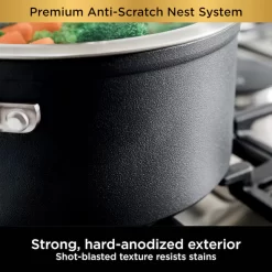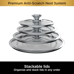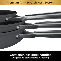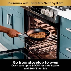 Our Ninjaâ„¢ Foodiâ„¢ Neverstick® Premium Anti-Scratch Nest System is the nesting cookware that won’t stick, chip, or flake. Our unique nesting design saves space and protects the cooking surfaces of your pots and pans during storage. This cookware is oven safe to 500°F, plus metal-utensil and dishwasher safe. As always, all of our cookware is free of PFOA, cadmium, and lead.
