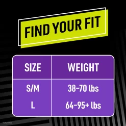 Ninjamas are available in sizes S/M and L/XL. S/M fits children 38-65 lb. (17-29 kg), and L/XL fits children 64-125 lb. (29-57 kg).