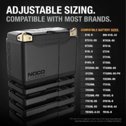 Introducing the NOCO Lithium NLP20 12V Lithium Powersports Battery, a Group 20 battery, rated at 7Ah (89Wh) and 600-amps of starting power. It’s better than lead-acid motorcycle batteries in almost every way: no sulfation, no activation, no acid, no maintenance, no water needed, and it comes fully charged and ready to install. It’s designed to withstand 50,000 start cycles and 2,000 charge cycles, making it the highest performing and longest-lasting battery for any motorcycle, ATV, UTV, PWC, scooter, or snowmobile. Its internal Battery Management System (BMS) ensures safe and reliable operation without requiring any manual reset of its BMS. And unleash the power of lithium and quickly recharge within minutes – even from 0% to starting with just 5-minutes of charge. Compatible with most powersports brands – Aprilla, BMW, Buell, Ducati, Harley-Davidson, Indian, Triumph, KTM, Argo, Can-Am, Honda, Husqvarna, Kawasaki, Suzuki, Arctic Cat, BRP, Waverunner, Polaris, Vespa – motorcycles, ATVs, UTVs, PWCs, quads, 4 wheelers, jet skis, seadoos, waverunners, scooters, riding lawn mowers, generators and more. Plus, it replaces lead-acid motorcycle models: B16L-B, B16CL-B, B18L-A, BTX15L, BTX15L-BS, BTX20L, BTX20LBS, BTZ20L, BTX20HL-BS, B50-N18L-A3, ETX16, ETX16L, ETX20L, GYZ20L, GYZ20HL, YTX15L, YTX15L-BS, YB16HL-A-CX, YB16L-B, YB16CL-B, SYB16L-B, YTX20HL, YIX20HL, YTX20HL-PW, YTX20HL-BS, YTX20HL-BS-PW, YIX20HL-BS, YTX20L, YTX20L-BS, and Y50-N18L-A3. Includes: NLP20 Group 20 7Ah Lithium Powersports Battery, (2) 3-Way Battery Terminals with (4) M6 Hex Screws, (1) Hex Key, (1) Removable Mounting Bracket, (1) 12mm Spacer, (3) 15mm Spacer, User Guide, and a 5-Year Limited Warranty.