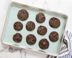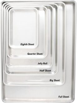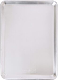 Nordic Ware’s line of Natural bakeware is designed for commercial use, and exceeds expectations in the home. Naturals bakeware pans is made of pure aluminum which will never rust for a lifetime of durability. Reinforced encapsulated steel rim prevents warping and adds strength. Set includes half sheet aluminum pan, silicone baking mat and cooling rack. Silicone baking mat makes for easy clean up, hand wash recommended on all pieces. Aluminum is reactive to acidic ingredients such as vinegar and tomato products. These foods may darken, pit or corrode the pan after prolonged use. Pan exterior dimensions 17.9 x 12.9 x 1 inches and interior dimensions 17.1 x 12.1 inches. Grid dimensions 16.9 x 11.5 x 0.9 inches. Silicone mat dimensions 16 x 11 inches. Pan made in USA. Imported components: silicone mat and grid.
