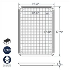 Our popular natural aluminum half sheet with a deluxe silicone liner and steel cooling grid is the perfect set for your kitchen or an even more delightful gift for your favorite baking friend. The Naturals® Bakeware collection is made of pure aluminum for superior heat conductivity and produces consistently evenly browned baked goods every time. Encapsulated galvanized steel rims prevent warping. These premium pans have lifetime durability and will never rust. Aluminum is reactive to acidic ingredients such as vinegar and tomato products. These foods may darken, pit or corrode the pan after prolonged use. Our deluxe liner is encapsulated in food grade silicone for durability. Silicone baking liner makes for easy clean up. No greasing required and replaces parchment paper and sticky nonstick sprays. Pan exterior dimensions 17.9 x 12.9 x 1 inches and interior dimensions 17.1 x 12.1 inches. Mat measures 16.1 x 11.1 inches and grid measures 16.9 x 11.5 x 0.9 inches. Proudly made in the USA by Nordic Ware with liner and rack imported. Pan oven safe up to 400 degrees, hand wash recommended on all pieces.
