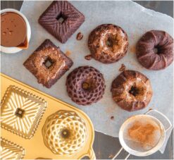Nordic Ware genuine Bundt pans are made of durable cast aluminum to achieve the most crisp, intricate cake detail possible. Cast aluminum’s superior heat conductivity ensures controlled, even browning of cakes and treats. Premium silicone nonstick is made without PFAS and PTFE for healthy baking and ensures effortless release and cleanup. Oven safe to 400 degrees Fahrenheit. This Bundtlette is perfect for baking mini cakes with beautiful details. With six individual portions, you can decorate each cake differently and make dessert extra special! Pan exterior measures 14.4 inches handle to handle, 8.3 inches wide and 1.6 inches in height. The pan capacity holds 3.5 cups in 6 cavities. Mixes and recipes may vary. Fill the pan no more than 3/4 full to avoid overflow. Proudly American Made since 1946, our heirloom-quality pieces are made to withstand a lifetime of use in your home kitchen.