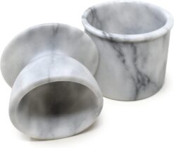 A butter lover’s dream! Once you start using this butter keeper, you won’t settle for hard butter again! Holding up to 1 stick of butter, the water in the base seals out air to keep the butter soft, sweet and spreadable for up to 30 days – without refrigeration! Simply pour approximately 1/2″ / 1.25cm of water in the basin, fill the top of the butter keeper with butter, turn it upside down so the water is covering the top of the butter, and PRESTO! Soft, sweet, spreadable butter that stays fresh. (Water should be changed every 2-3 days). Made of attractive marble, that naturally keeps butter cool. Beautiful to display on your table or counter top. Hand washing recommended. Helpful Tip: Allow the stick of butter to soften first, then pack the butter into lid.