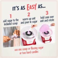 - Simple operation – warm up the unit, add your flossing sugar, and enjoy your cotton candy in just a few short minutes