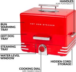 Nostalgia Extra Large Retro Classic Style Steamer Warmer, 20 Hot Dog and 6 Bun Capacity, Steam Bratwursts, Sausages, Vegetables, Fish, Dumplings, Original Red