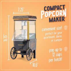 - POPCORN CAPACITY: Whether it’s movie time or snack time, this vintage popcorn machine cart pops up to 12 cups of movie theater popcorn per batch. The included measuring cup ensures you use the proper amount of kernels for each batch.