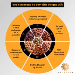 - FRESH & HEALTHY NUTS IS WHAT EVERYONE APPRECIATES – ALL THE NUTS IN OUR SNACK TRAY (EXCEPT TOFFEE PEANUTS & PISTACHIOS) ARE HAND-PICKED AND ROASTED IN HOUSE IN SMALL BATCHES IN OUR ROASTING FACILITY, NEVER REPACKAGED, THE NUTS ARE CONSTANTLY RESTOCKED. IN ADDITION, YOUR HEALTH CONCERNS US, THEREFORE ALL OUR NUTS ARE DRY ROASTED WITHOUT ANY OILS OR PRESERVATIVES. GIVE IT A TRY AND YOU’LL BE SURPRISED AND REMEMBER IF YOUR NOT SATISFIED YOU WON’T PAY.