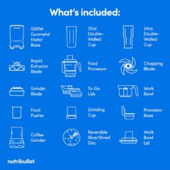 - Included: 1200W Motor Base, Rapid Extractor Blade, 2-cup Food Processor, Chopping Blade, Slice/Shred Disc, Coffee & Spice Grinder attachment, 32oz Blending cup, 24oz Double Wall Blending cup, (2) To Go Lids, and User Guide