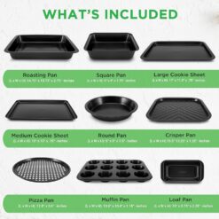 Features: – Flexible and Nonstick Carbon Steel Bakeware Set – Professional Home Kitchen Bake Pan Set – Commercial Grade Restaurant Quality Metal Bakeware – Durable and Reliable Cookie and Muffin Sheet Oven Pan Style – Attractive, Stylish Non-Stick Gray Silicone Coating – Dishwasher Safe – Recommended for Hand-wash Only – Long-Lasting, Stain-Resistant and Easy-to-Clean – Space-Saving Stackable Wide Tray Pan Design – Ideal for Baking a Number of Astonishing Baked Goods – Metal, Reusable, Quality Kitchenware For Cooking and Baking Cake Loaf, Muffins and More – Suitable for Oven, Refrigerator, and Freezer – PFOA, PFOS, PTFE Fee What’s In The Box: – (1) Roasting Pan – (1) Oven Crisper Pan – (1) Round Pizza Pan – (1) Medium Cookie Sheet – (2) Round Cake Pans – (1) Square Cake Pan – (1) Loaf Pan – (1) Large Cookie Sheet – (1) 12 Cup Muffin Pan Technical Specs: – Temperature Resistance: Up to 446° Fahrenheit (230° Celsius) – Construction Material: Carbon Steel – Metal Tray Thickness: 0.35-0.4MM – Roasting Pan Size (L x W x H): 14.75″ x 10.75″ x 2.75″ -inches – Round Pizza Pan Size (L x W x H): 12.8” x 0.6” -inches – Large Cookie Sheet Size (L x W x H): 17″ x 11.5″ x .75″ -inches – Medium Cookie Sheet Size (L x W x H): 15″ x 10″ x .75” -inches – Round Cake Pans Size (L x W x H): 9″ x 9″ x 1.5″ -inches – Square Cake Pan Size (L x W x H): 9″ x 9″ x 1.75″ -inches – Loaf Pan Size (L x W x H): 10″ x 5.75″ x 2.25″ -inches – Oven Crisper Pan Size (L x W x H):15.5″ 13.25″ x 1.25″ -inches – 12-Cup Muffing Pan Size (L x W x H): 13.8″ x 10.4″ x 1.18” -inches.