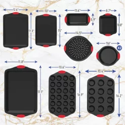 - Flexible, non-stick carbon steel bakeware set with red silicone handles