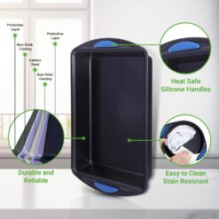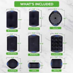 Features: – Flexible & Nonstick Carbon Steel Bakeware Set With Red Silicone Handles – Professional Home Kitchen Bake Pan Set – Commercial Grade Restaurant Quality Metal Bakeware – Durable & Reliable Cookie & Muffin Sheet Oven Pan Style – Attractive, Stylish Non-Stick Gray Silicone Coating – Dishwasher Safe – Recommended for Hand-wash Only – Long-Lasting, Stain-Resistant & Easy-to-Clean – Space-Saving Stackable Wide Tray Pan Design – Ideal for Baking a Number of Astonishing Baked Goods – Metal, Reusable, Quality Kitchenware For Cooking & Baking Cake Loaf, Muffins & More – Suitable for Oven, Refrigerator, and Freezer – PFOA, PFOS, PTFE Free What’s In The Box: – (1) Small Baking Pan – (1) Big Baking Pan – (1) Pizza Pan – (1) Small Cookie Sheet – (1) Square Pan – (1) Loaf Pan – (1) Big Cookie Sheet – (2) Round Pan – (1) 12 Cup Muffin Pan Technical Specs: – Temperature Resistance: Up to 446° Fahrenheit (230° Celsius) – Construction Material: Carbon Steel – Metal Tray Thickness: 0.6mm – Small Baking Pan Size (L x W x H): 15.7’’ x 9.8’’ x 2.1’’ -inches – Big Baking Pan Size (L x W x H): 17.9’’ x10.8’’ x 2.1’’ -inches – Pizza Pan Size (L x W x H): 15’’ x 12.9’’ x 0.9” -inches – Small Cookie Sheet Size (L x W x H): 15.7’’ x 9.8’’ x 0.9” -inches – (2) Round Pan Size (L x W x H): 11.6” x 9.8” x 1.7” -inches – Square Pan Size (L x W x H): 11.6’’ x 9.84’’ x 1.77’’ -inches – Loaf Pan Size (L x W x H): 11.8’’ x 6.1’’ x 2.8” -inches – Big Cookie Sheet Size (L x W x H): 17.9’’ x 10.8’’ x 0.9” -inches – 12 Cup Muffin Pan Size (L x W x H): 16.3’’ x 10.9’’ x 1.18” -inches