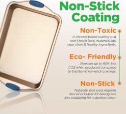 Features: – Flexible & Nonstick Carbon Steel Bakeware Set With Blue Silicone Handles – Professional Home Kitchen Bake Pan Set – Commercial Grade Restaurant Quality Metal Bakeware – Durable & Reliable Cookie Sheet Oven Pan Style – Attractive, Stylish Non-Stick Gold Silicone Coating – Dishwasher Safe – Recommended for Hand-wash Only – Long-Lasting, Stain-Resistant & Easy-to-Clean – Space-Saving Stackable Wide Tray Pan Design – Ideal for Baking a Number of Astonishing Baked Goods – Metal, Reusable, Quality Kitchenware For Cooking & Baking Cake Loaf, Muffins & More – Suitable for Oven, Refrigerator, and Freezer – PFOA, PFOS, PTFE Free What’s In The Box: – (1) Baking Pan – (1) Pizza Pan – (1) Small Cookie Sheet – (2) Round Pan – (1) Square Pan – (1) Loaf Pan – (1) Big Cookie Sheet – (1) 12 Cup Muffin Pan – (1) 24 Cup Muffin Pan Technical Specs: – Temperature Resistance: Up to 446° Fahrenheit (230° Celsius) – Construction Material: Carbon Steel – Metal Tray Thickness: 0.4mm – Baking Pan Size (L x W x H): 17.32” x 12.6” x 1.96” -inches – Pizza Pan Size (L x W x H): 14.56” x 12.99” x 0.78” -inches – Small Cookie Sheet Size (L x W x H): 15.15” x 10” x 0.59” -inches – Round Pan Size (L x W x H): 11.18” x 9.68” x 1.57” -inches – Square Pan Size (L x W x H): 10.82” x 8.74” 1.85” -inches – Loaf Pan Size (L x W x H): 11.69” x 5.94” x 2.55” -inches – Big Cookie Sheet Size (L x W x H): 17.12” x 11.8” x 0.67” -inches – 12 Cup Muffin Pan Size (L x W x H): 16.22” x 10.43” x 1.18” -inches – 24 Cup Muffin Pan Size (L x W x H): 16.92” x 10.62” x 0.98” -inches