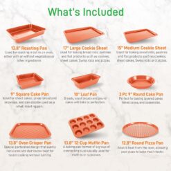 - 10-PIECE SET: The 10-Piece Baking Pan Set offers complete high-quality kitchenware for baking cake, loaf, muffins. Includes roasting pan, oven crisper pan, pizza pan, medium & large cookie sheet, 2 round 1 square cake pan, loaf pan, 12 cup muffin pan