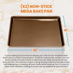 2 Pcs. Professional Home Kitchen Bake Pans – Non-Stick Coated Layer Surface, Dishwasher Safe, PFOA, PFOS, PTFE Free Features: • Professional Home Kitchen Bake Pans • Commercial Grade Restaurant Quality Metal Bakeware • Durable & Reliable Cookie Sheet Oven Pan Style • Attractive, Stylish Metallic Coating • Non-Stick Coated Layer Surface • Dishwasher Safe • Long-Lasting, Stain-Resistant & Easy-to-Clean • Premium Food Grade Bake Pan Construction • Space-Saving Stackable Wide Tray Pan Design • Not Recommended for Microwave and Any Appliances that Use Fire • Ideal Use for Baking Cake, Cookie, Bread, Brownies, Lasagna, etc. • Used with Kitchen Ovens, Countertop Convection Ovens, Toaster Ovens • Great for Food Prep, Serving, Pastry Dessert Baking • PFOA, PFOS, PTFE Free What’s in the Box: • (2) Mega Bake Pans (2 qt.) Technical Specs: • Temperature Resistance: Up to 446° Fahrenheit (230° Celsius) • Metal Tray Thickness: 0.7mm • Construction Material: Engineered Carbon Steel Metal Alloy • Mega Baking Pan Size (L x W x H): 21.9” x 15.8” x 1 ” -inches • Sold as: 1 • Weight: 7.47 lbs.