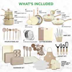 - MARBLE NON-STICK COATING – Enjoy durable non-stick performance with our brown cookware set, including 5 pans and 4 pots with lids. Bakeware set includes: roaster pan, square pan, baking tin, muffin pan and loaf pan. Nylon Utensil Set. Knife Gadget Set
