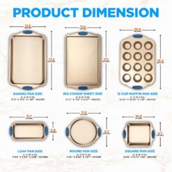 Features: – Flexible & Nonstick Carbon Steel Bakeware Set With Blue Silicone Handles – Professional Home Kitchen Bake Pan Set – Commercial Grade Restaurant Quality Metal Bakeware – Durable & Reliable Cookie & Muffin Sheet Oven Pan Style – Attractive, Stylish Non-Stick Gold Silicone Coating – Dishwasher Safe – Recommended for Hand-wash Only – Long-Lasting, Stain-Resistant & Easy-to-Clean – Space-Saving Stackable Wide Tray Pan Design – Ideal for Baking a Number of Astonishing Baked Goods – Metal, Reusable, Quality Kitchenware For Cooking & Baking Cake Loaf, Muffins & More – Suitable for Oven, Refrigerator, and Freezer What’s In The Box: – (1) Roaster Pan – (1) Round Pan – (1) Square Pan – (1) Loaf Pan – (1) Big Cookie Sheet – (1) 12 Cup Muffin Pan Technical Specs: – Temperature Resistance: Up to 446° Fahrenheit (230° Celsius) – Construction Material: Carbon Steel – Metal Tray Thickness: 0.4mm – Roaster Pan Size (L x W x H): 17.3” x 12.6” x 1.96” -inches – Round Pan Size (L x W x H): 11.18” x 9.68” x 1.57” -inches – Square Pan Size (L x W x H): 10.82” x 8.74” 1.85” -inches – Loaf Pan Size (L x W x H): 11.69” x 5.94” x 2.55” -inches – Big Cookie Sheet Size (L x W x H): 17.12” x 11.8” x 0.67” -inches – 12 Cup Muffin Pan Size (L x W x H): 16.22” x 10.43” x 1.18” -inches