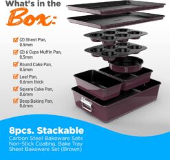 - 8 PIECE SET: The 8 piece nonstick bakeware kit includes (2) sheet pans, (2) 6 Cups Muffin Pan, (1) Round Cake Pan, (1) Loaf Pan, (1) Square Cake Pan, (1) Deep Baking Pan, allowing you to make bulk batches of oven-baked goodies