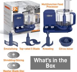 - 6 ATTACHMENT BLADE: The 12 cup food processor set includes slicer/shredder & masher blade disc, chopper, dough kneading, & emulsifying blades, & citrus juicer to easily mash nuts, shred vegetable/fruit, chop meat, mix flour & more w/ just 1 machine