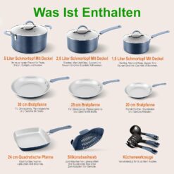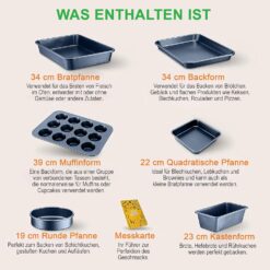 | Included Components | Sauce pot with lid (1.5QT and 2.5QT), Dutch oven pot with lid (5QT), small, medium, and large skillet fry pans, soup ladle, pasta fork, spatula, silicone strainer, muffin pan, loaf pan, round pan, square pan, roast pan, and baking tin |