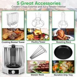 - ACCESSORIES INCLUDED: Comes complete with skewer rack with 8 skewers, cooking basket tower, roasting rack, poultry tower, and nonstick drip tray. Perfect for whole chicken roast, breasts, turkey, lamb, beef, and pork
