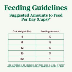 * Every cup of our food is nutrient dense so your cat gets the right amount of calories in a complete and nutritious meal. * To help maintain freshness, seal bag tightly and store in a cool, dry location. Suggested Amounts to Feed Per Day (Cups)‡ Cat Weight Feeding Amount 4 lbs. 1/3 8 lbs. 1/2 12 lbs. 2/3 16 lbs. 3/4 20 lbs. 1 ‡ Use a standard 8 oz. measuring cup which holds 3.64 oz. of NUTROTM WHOLESOME ESSENTIALS™ Indoor Senior Farm-Raised Chicken & Brown Rice Recipe Cat Food.