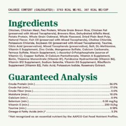 Chicken, Chicken Meal, Pea Protein, Whole Brown Rice, Brewers Rice, Chicken Fat (preserved with Mixed Tocopherols), Dehydrated Alfalfa Meal, Potato Protein, Whole Grain Oatmeal, Flaxseed, Dried Plain Beet Pulp, Natural Flavor, Soybean Oil (preserved with Mixed Tocopherols), Potassium Chloride, Fish Oil (preserved with Mixed Tocopherols), Choline Chloride, Salt, DL-Methionine, Mixed Tocopherols and Citric Acid (preservatives), Taurine, Zinc Sulfate, Vitamin E Supplement, L-Ascorbyl-2-Polyphosphate (source of Vitamin C), Iron Amino Acid Chelate, Yucca Schidigera Extract, Vitamin B12 Supplement, Copper Amino Acid Chelate, Niacin Supplement, Manganese Amino Acid Chelate, Biotin, Riboflavin Supplement (Vitamin B2), D-Calcium Pantothenate, Thiamine Mononitrate (Vitamin B1), Vitamin A Supplement, Pyridoxine Hydrochloride (Vitamin B6), Sodium Selenite, Vitamin D3 Supplement, Potassium Iodide, Folic Acid, Rosemary Extract